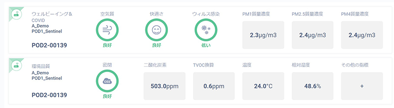 POD2のソフトウェアには、各種センサーによる測定データに基づいて算出される5種類の指数を用意しています。クラウド上のダッシュボードでリアルタイムに確認することができ、それぞれ設定した指数の許容値を超えた場合に、SMS等でアラート通知する機能も備えており、室内の様々な環境変化に対してタイムリーかつ適切に対応することが可能となります。