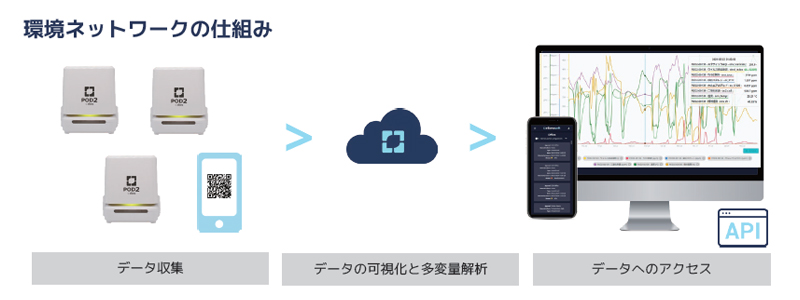 POD2は、一つの建物内で複数台、また離れた場所の関連施設にも複数台設置し、クラウド上でデータを一元管理できます。専用ソフトウェア EllonaSoftは、各パラメータの許容範囲を設定し、強度がその範囲を越えたときにアラームを出し、SMSやEメールに送信する機能を有しており、測定だけでなく解決(環境修復)に向けたアクションに繋げます。主成分分析、判別分析、統計的品質管理(SQC)、PLS回帰の4つの数学的統計手法も利用できます。