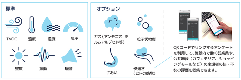 室内環境IoTセンサーポッド POD2 は、室内環境の快適さの指標として、温度、湿度、照度、振動、騒音のほか、有害な化学物質やにおいなどのガス成分まで、 最大10種類のパラメータを連続的(10秒ごとに更新)に測定可能なセンサーが内蔵されたモニタリングユニットです。 また、客観的な測定値のほか、QRコードによる個人の快・不快に関わる主観情報を追加できるのも、大きな特徴です。