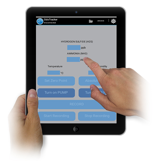 Odotrackerには、サンプリングポンプ、2種類のケミカルセンサー(注文時に指定)、OdoTrackerアプリケーションプログラム(別途、Androidの携帯電話/タブレット等にダウンロード可能)が含まれています。 各サンプリング場所に関して、直ちに記録されまます。
